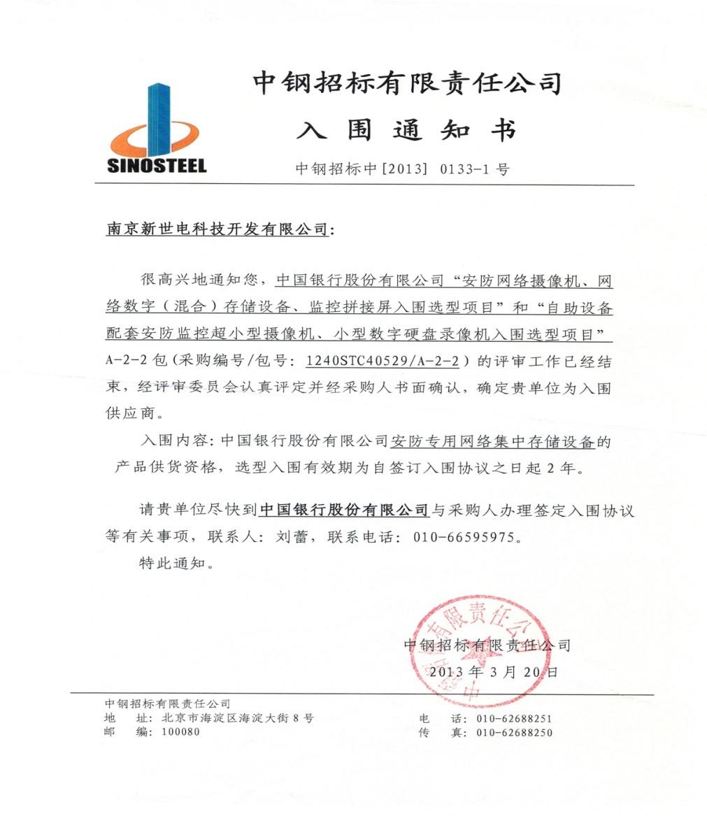 2013年3月20日,公司接到中國銀行總行通知,新世電在中國銀行股份有限公司“安防網(wǎng)絡(luò )攝像機、網(wǎng)絡(luò )數字(混合)存儲設備、監控拼接屏入圍選型項目”和“自助設備配套安防監控超小型攝像機、小型數字硬盤(pán)錄像機入圍選型項目”A-2-2包(采購編號/包號1240STC40529/A-2-2)的競爭性談判采購中,經(jīng)評審委員會(huì )認真評定并經(jīng)采購人書(shū)面確認,確定新世電為入圍供應商,入圍內容:中國銀行股份有限公司安防專(zhuān)用網(wǎng)絡(luò )集中存儲設備的產(chǎn)品供貨資格,選型入圍有效期為自簽訂入圍協(xié)議之日起2年。
